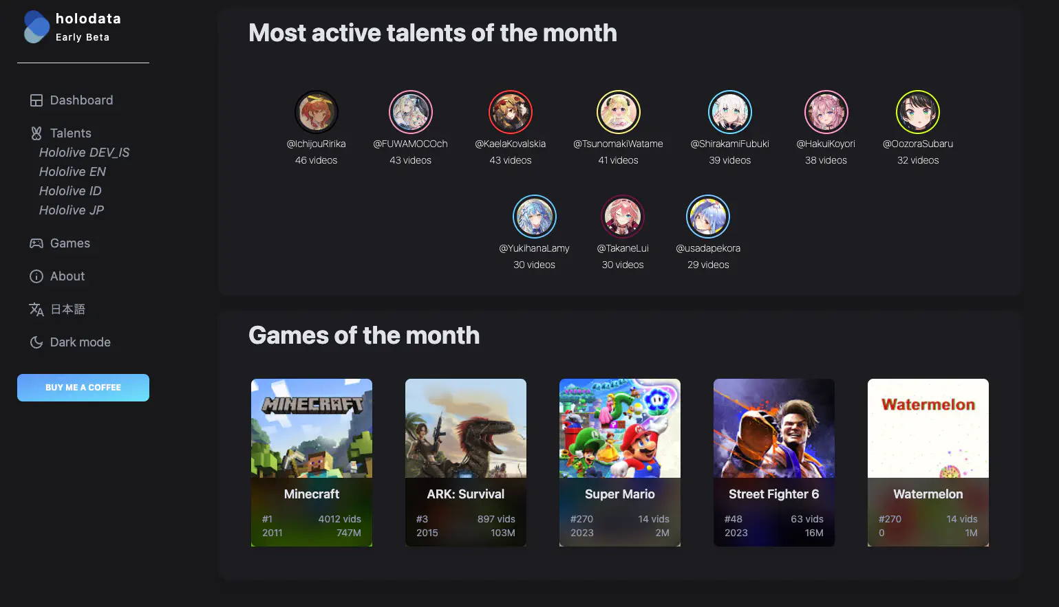 If you are an Hololive fan, you may also be interested in the Holodata website. It is a website that let you see the stats of the Hololive talents. You can see the number of subscribers, the number of games played, interactions. It is still in a beta but you can maybe still find some interesting informations there.